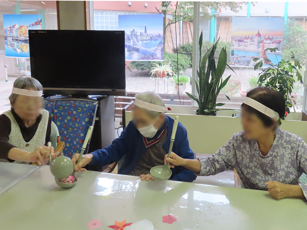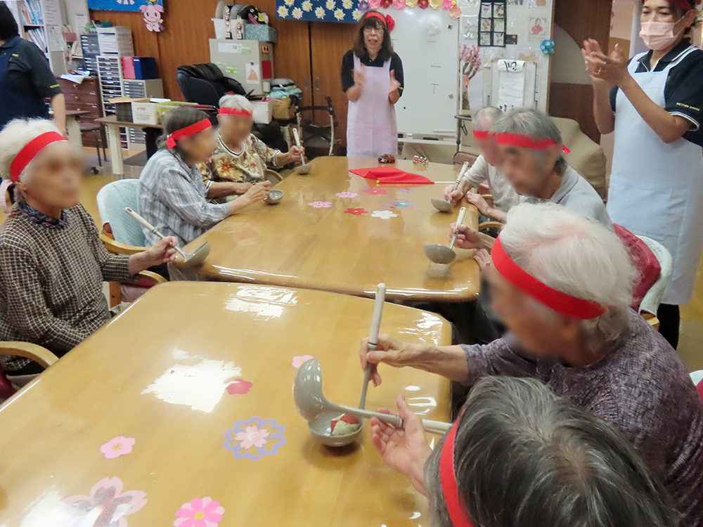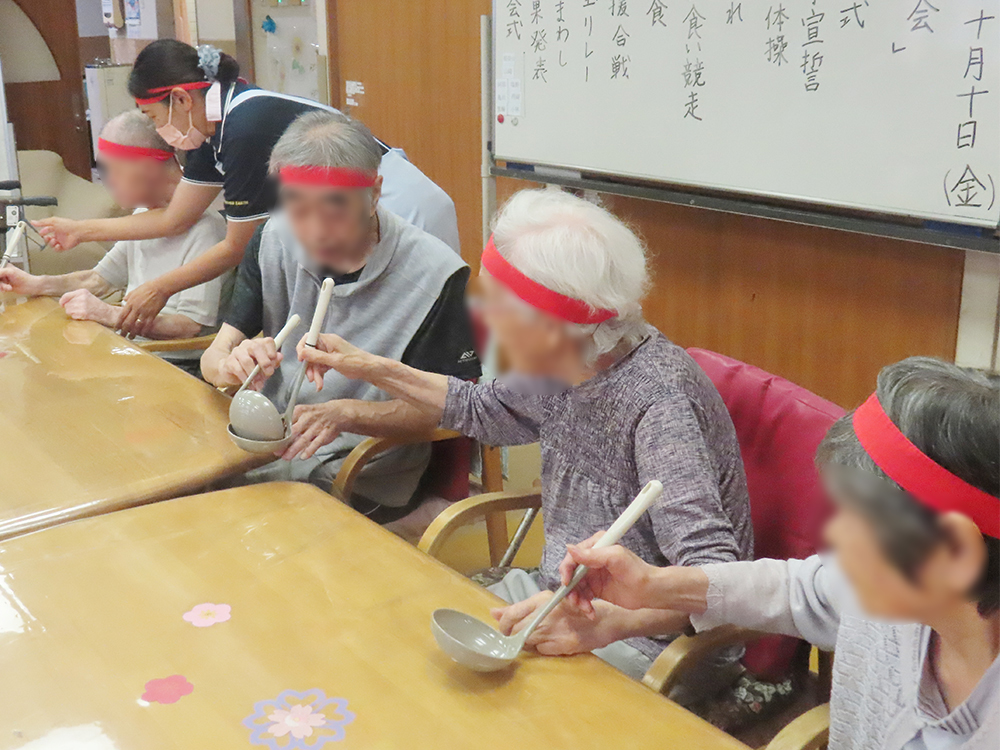 「そーっと、そーっと…」と真剣な表情でお玉を見つめる利用者様。