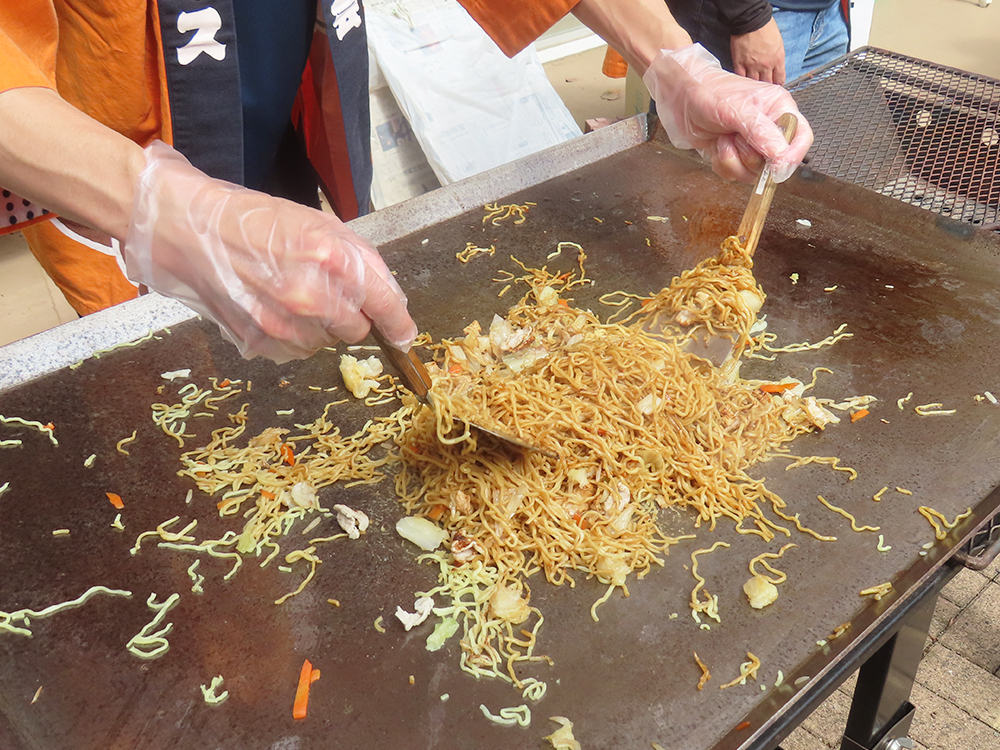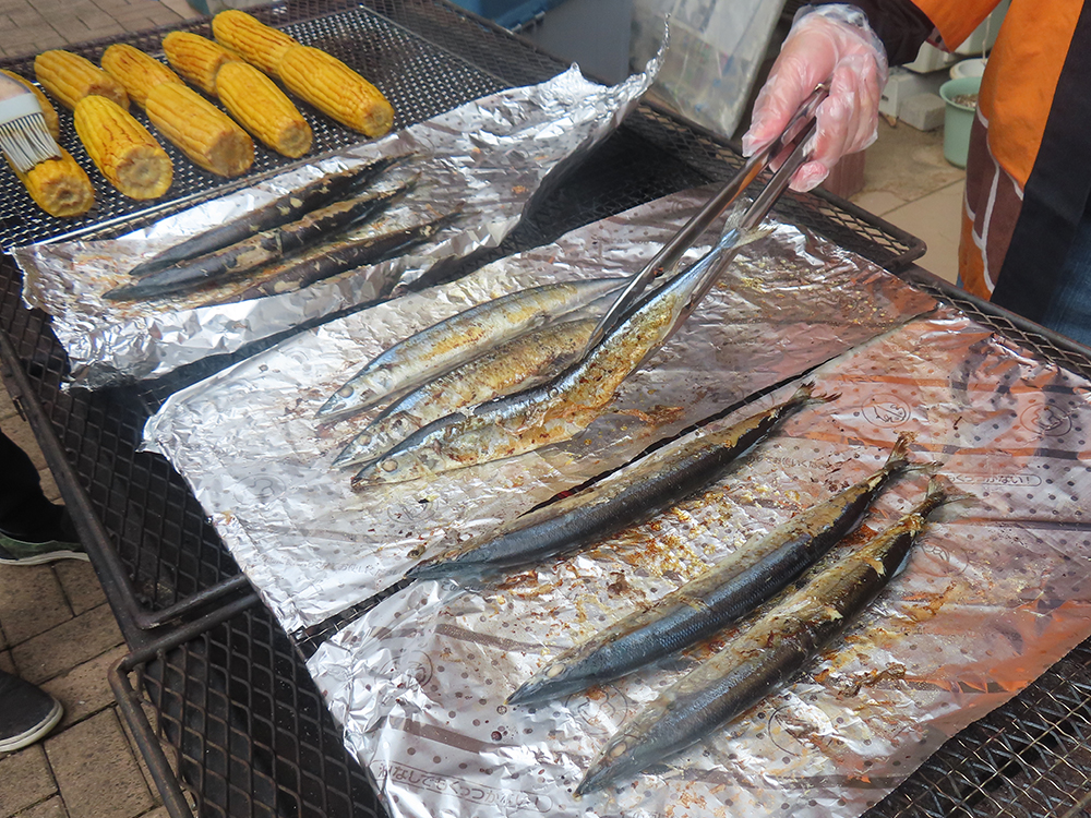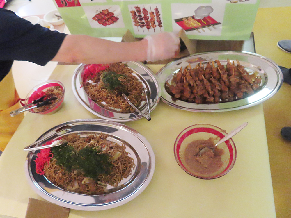 メニューは秋刀魚、豚汁、柔らか大学芋、果物、ケーキ、とうもろこし、焼きそば、たこ焼き、焼き鳥など、彩り豊かに並びました。