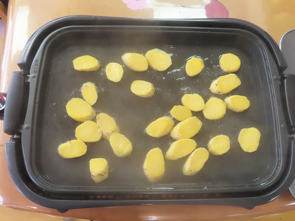 ホットプレートに少量の水を張り、下ごしらえしたサツマイモを並べて蒸します。