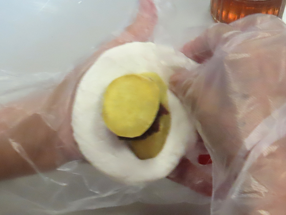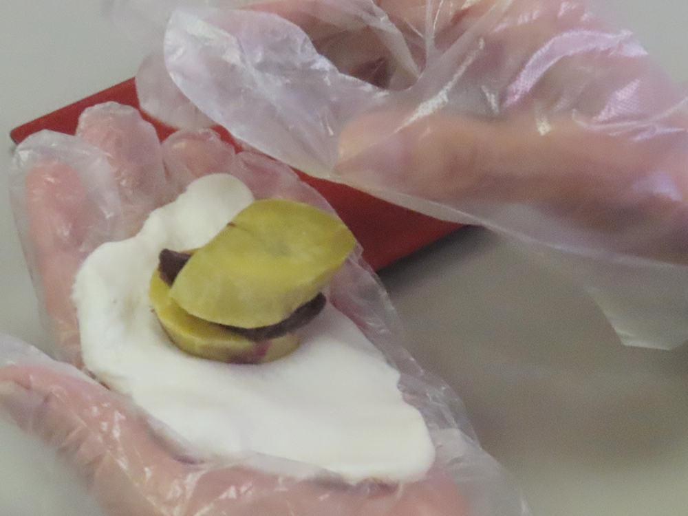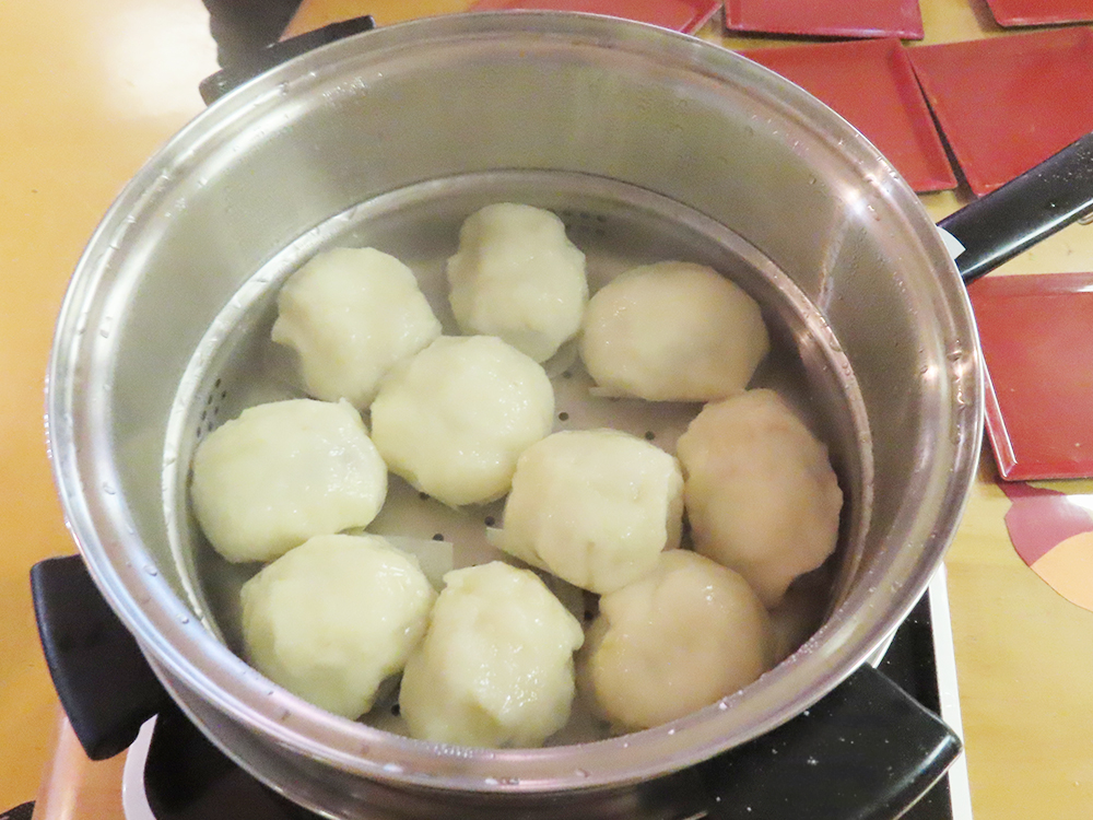 サツマイモにあんこを挟み、生地を伸ばして包み終わったら、いよいよ蒸し器へ。「蒸し上がるのが楽しみだね」「いい香りがしてきた!」