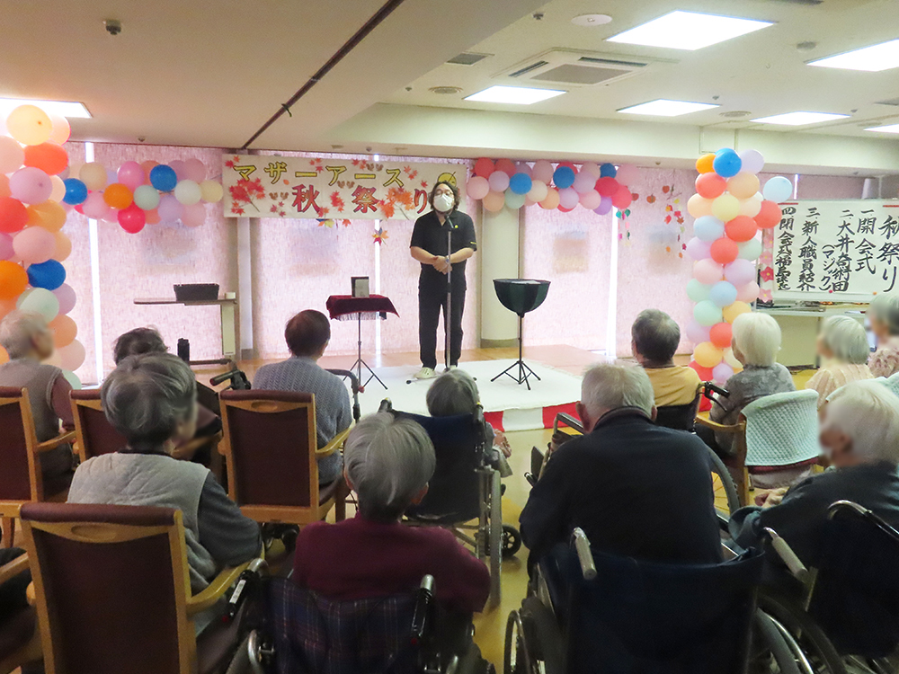 午後になり、秋祭り特設ステージに集まっていただきました。まずは、稲荷山施設長より挨拶を頂きました。