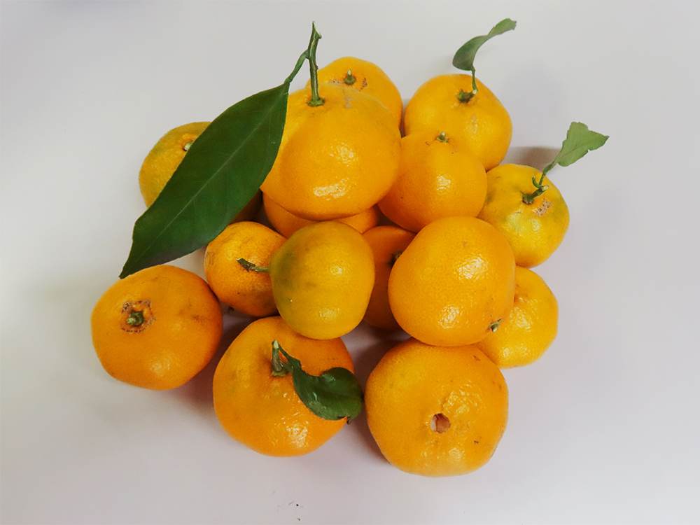 収穫したみかんを手に、