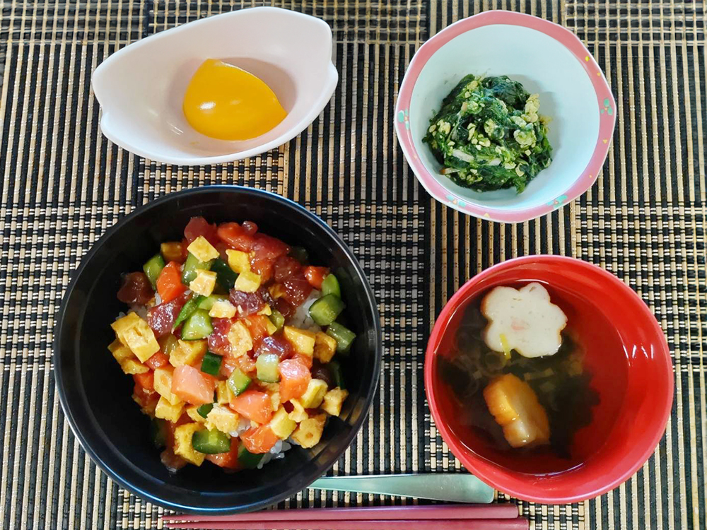 ちらし寿司は、酢飯の上にだし醤油に漬けておいたマグロ・サーモン、そしてきゅうり・厚焼卵を散らしています。