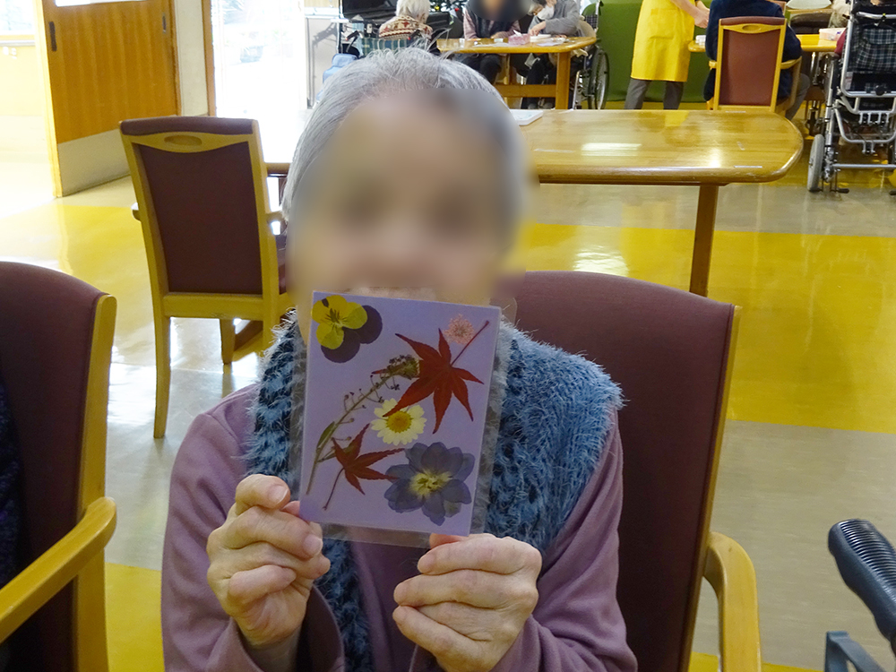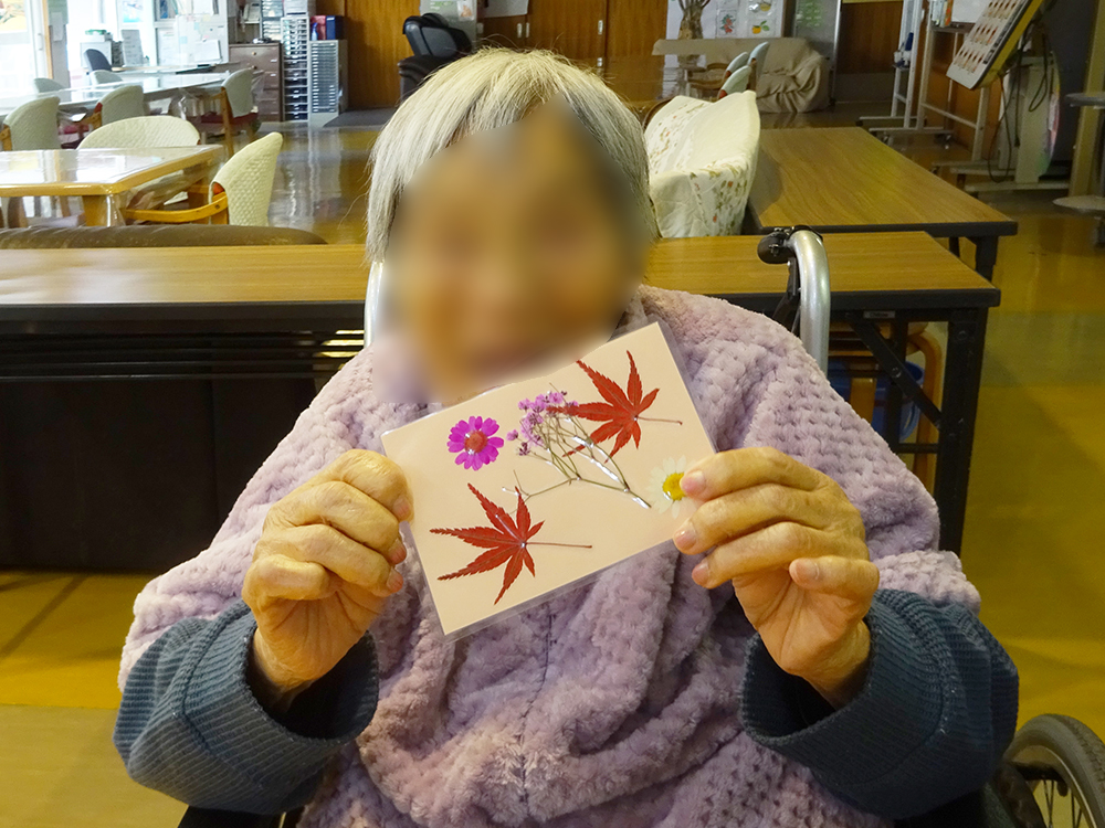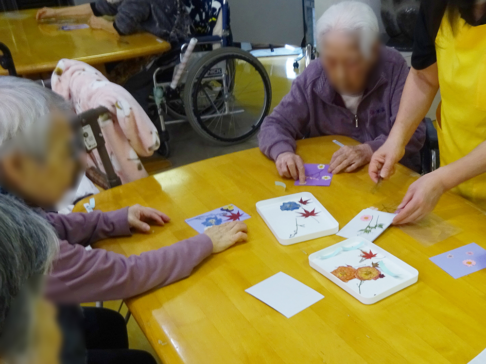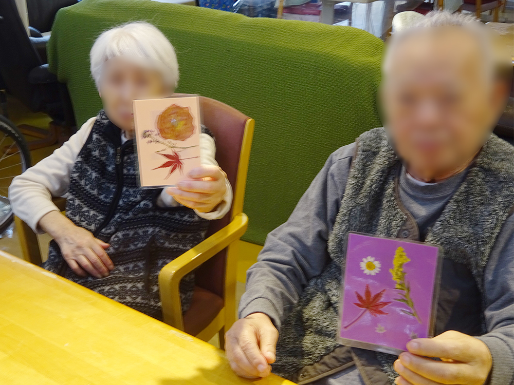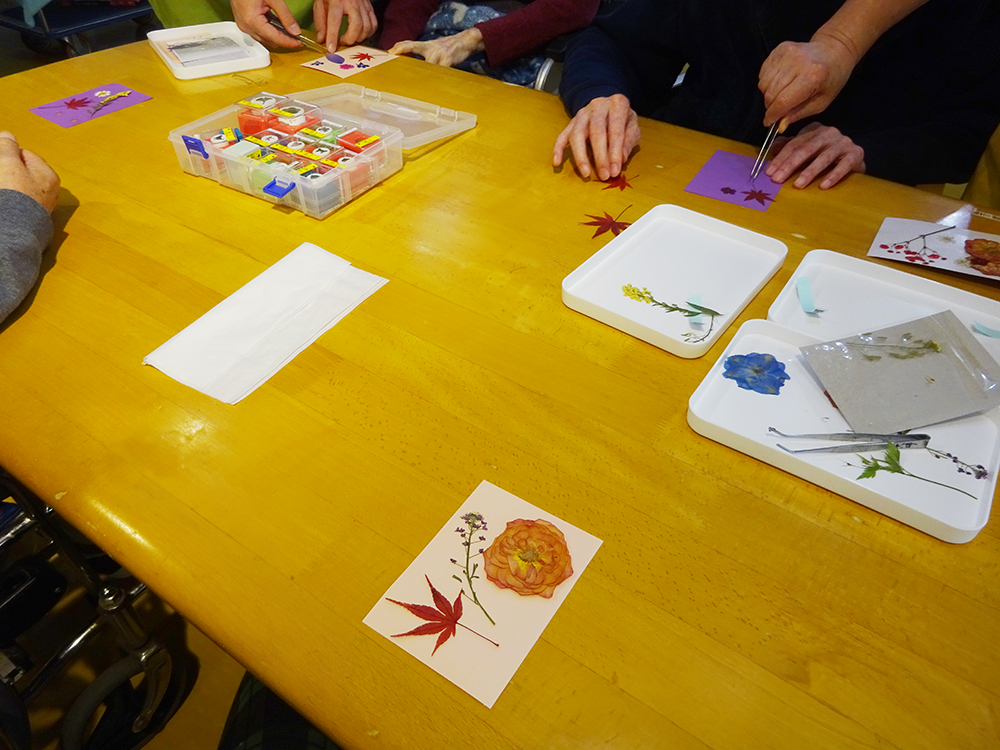 1F特養・ショートステイでは、もみじや季節の花を使った「押し花作り」を行いました。