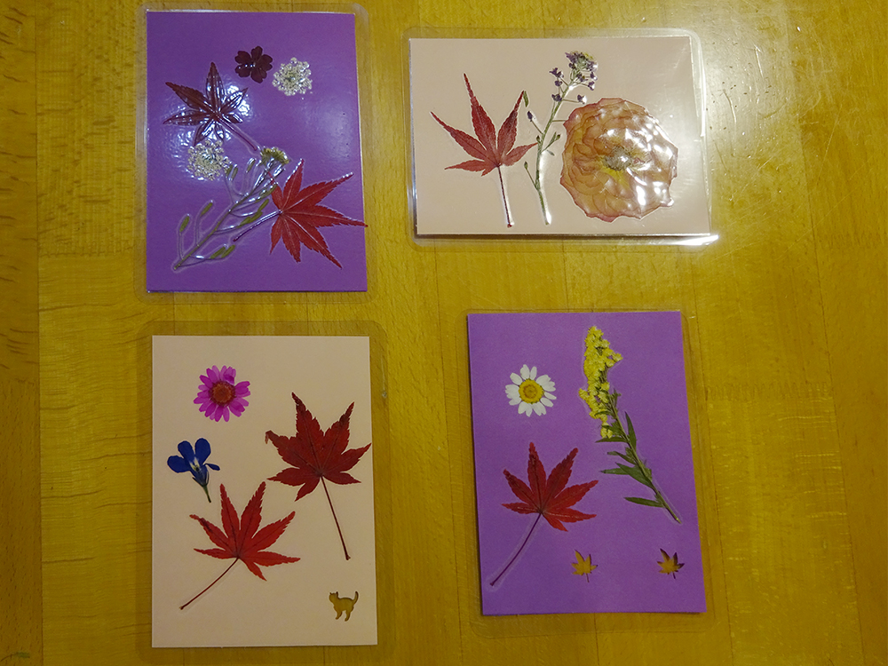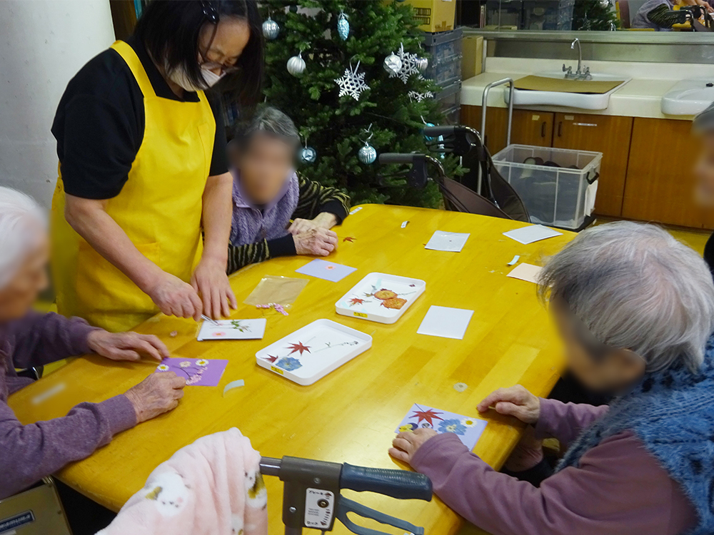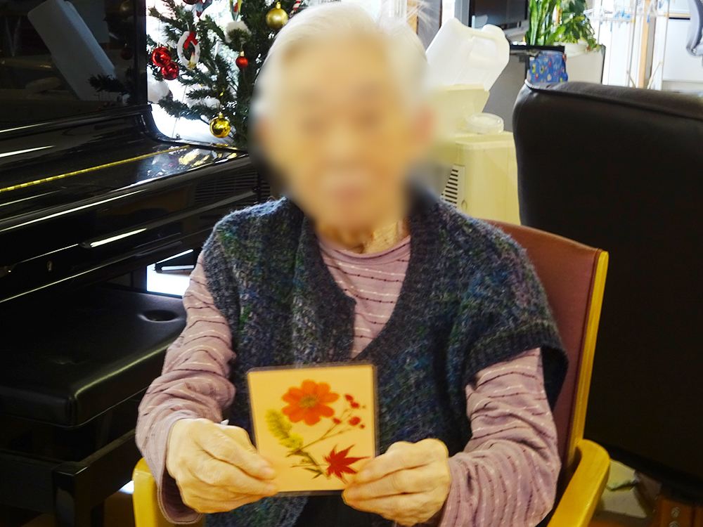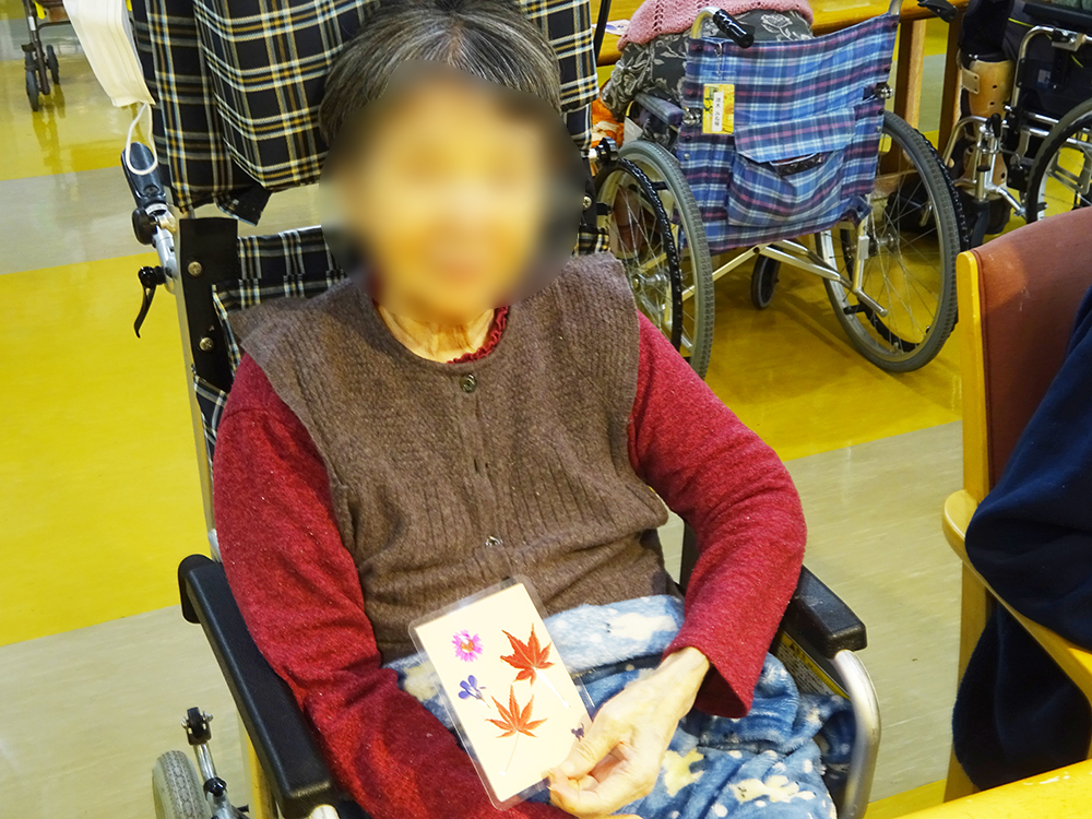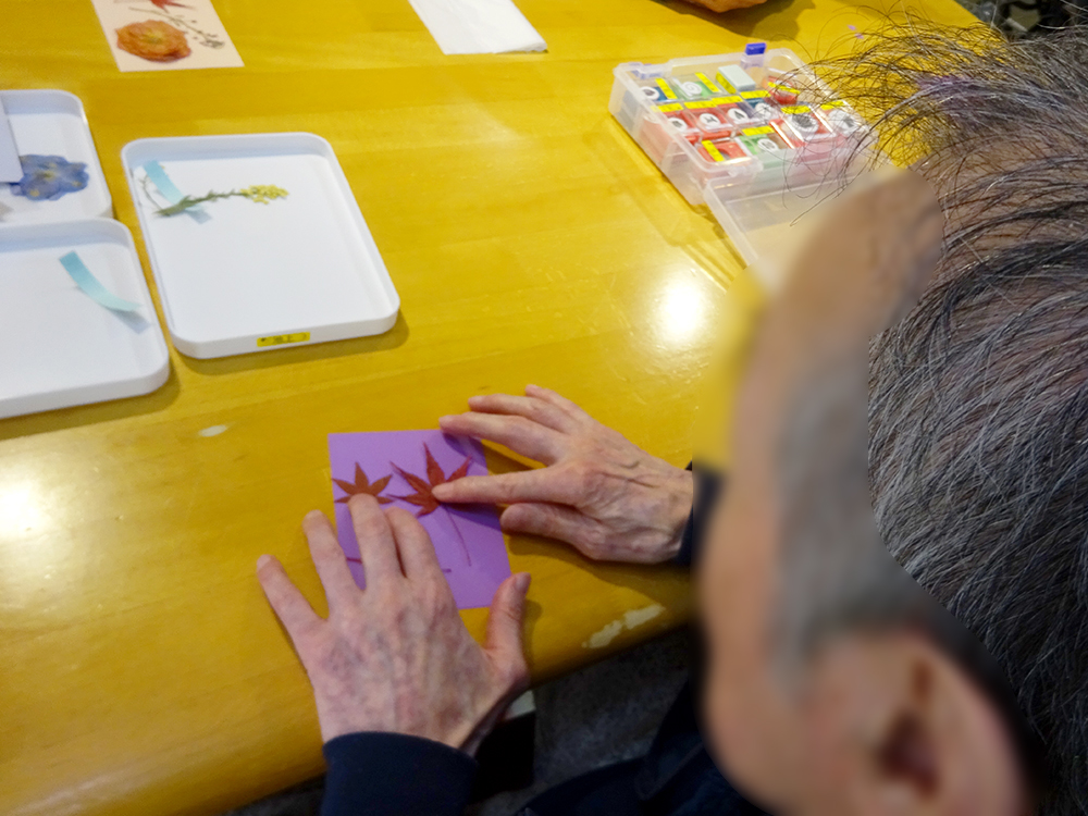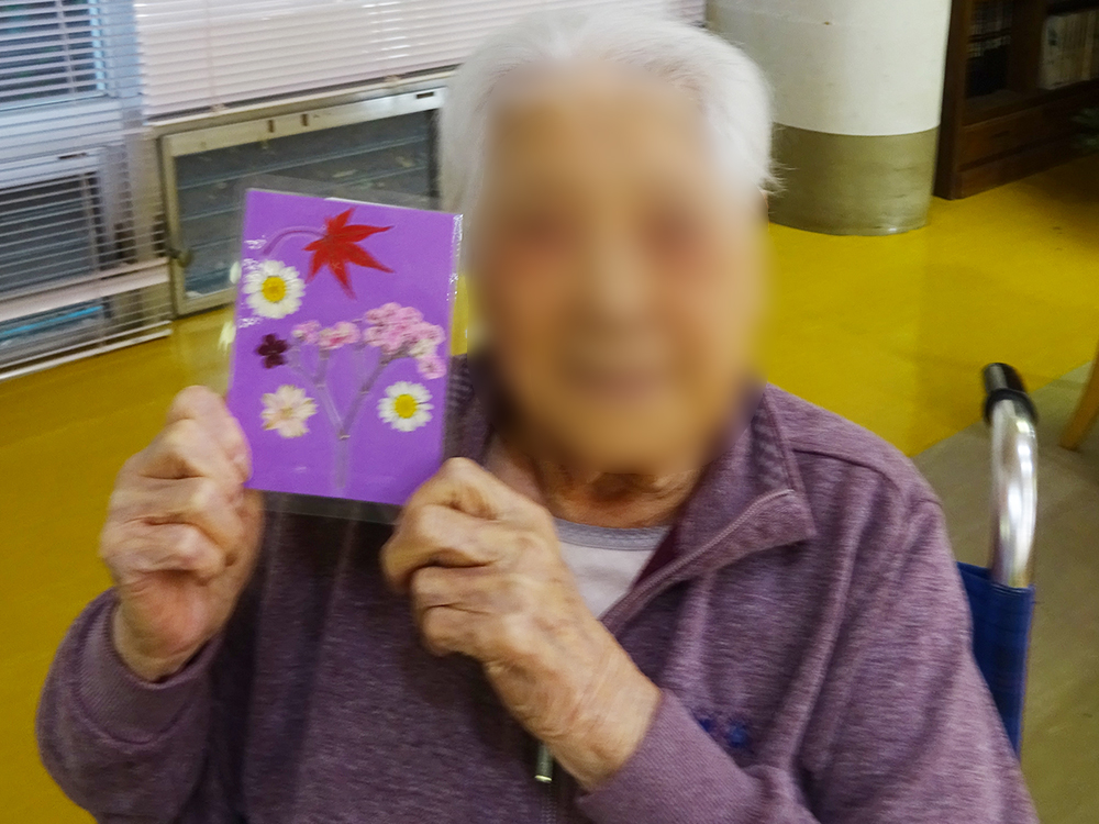 1F特養・ショートステイでは、もみじや季節の花を使った「押し花作り」を行いました。