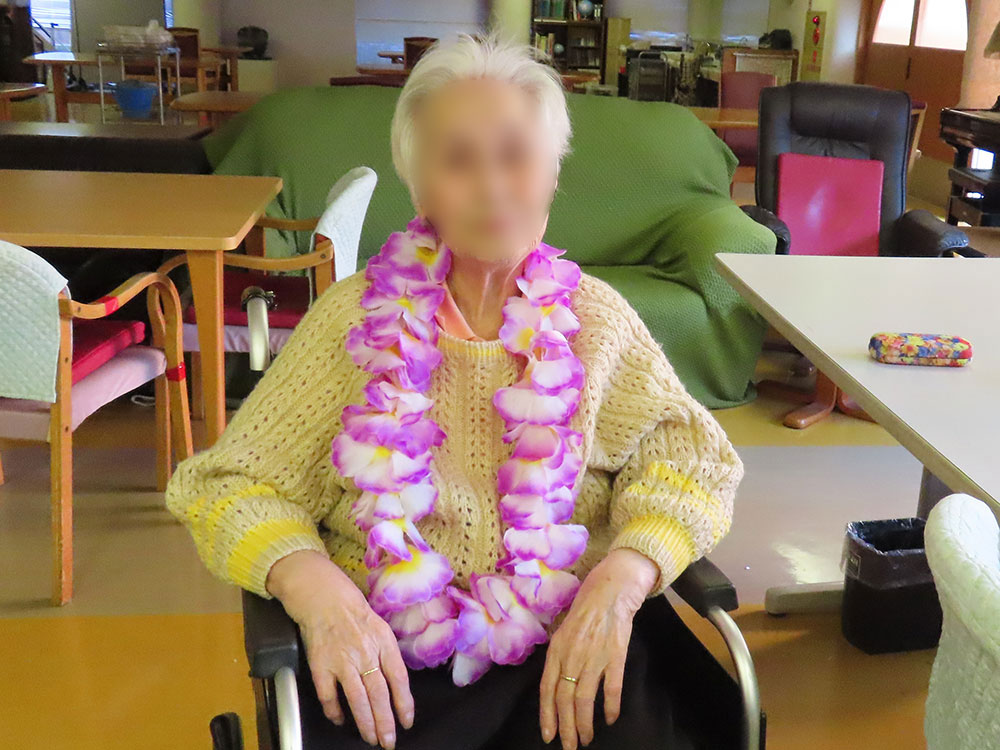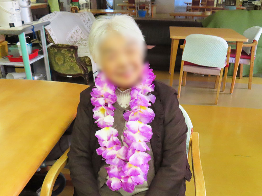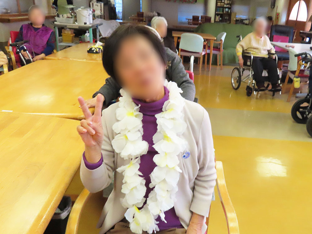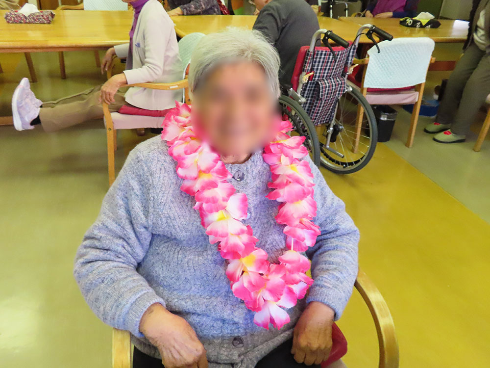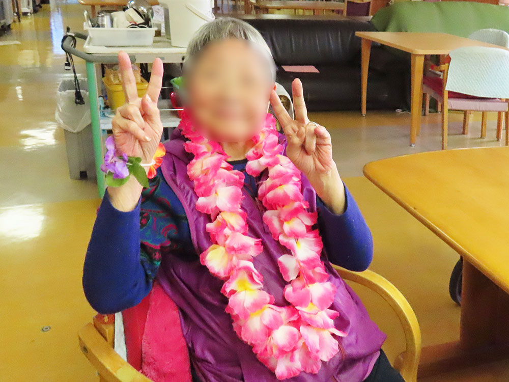 利用者様はレイやブレスレットを身につけ、南国の雰囲気を楽しみました。