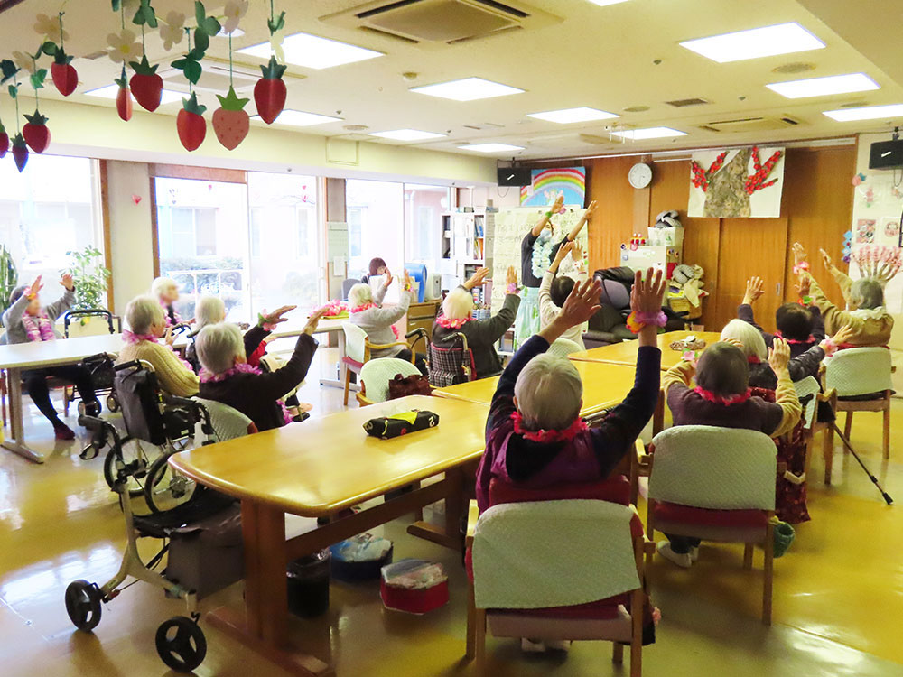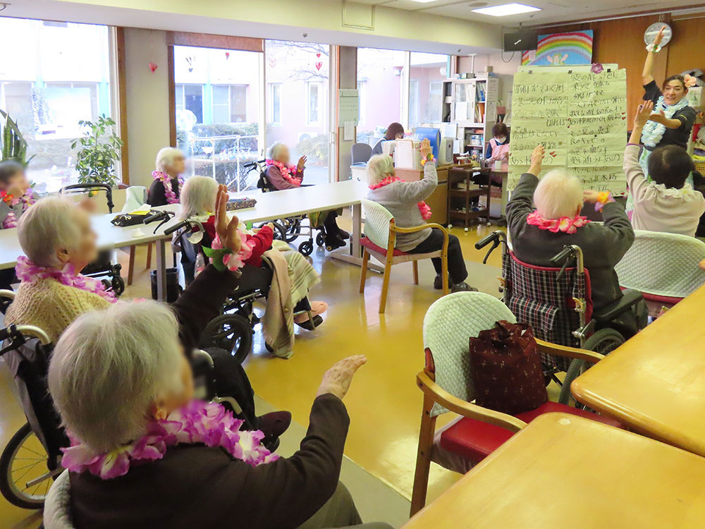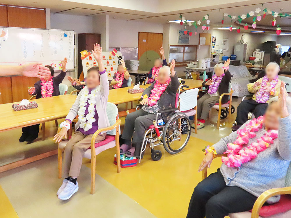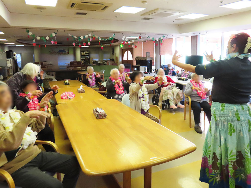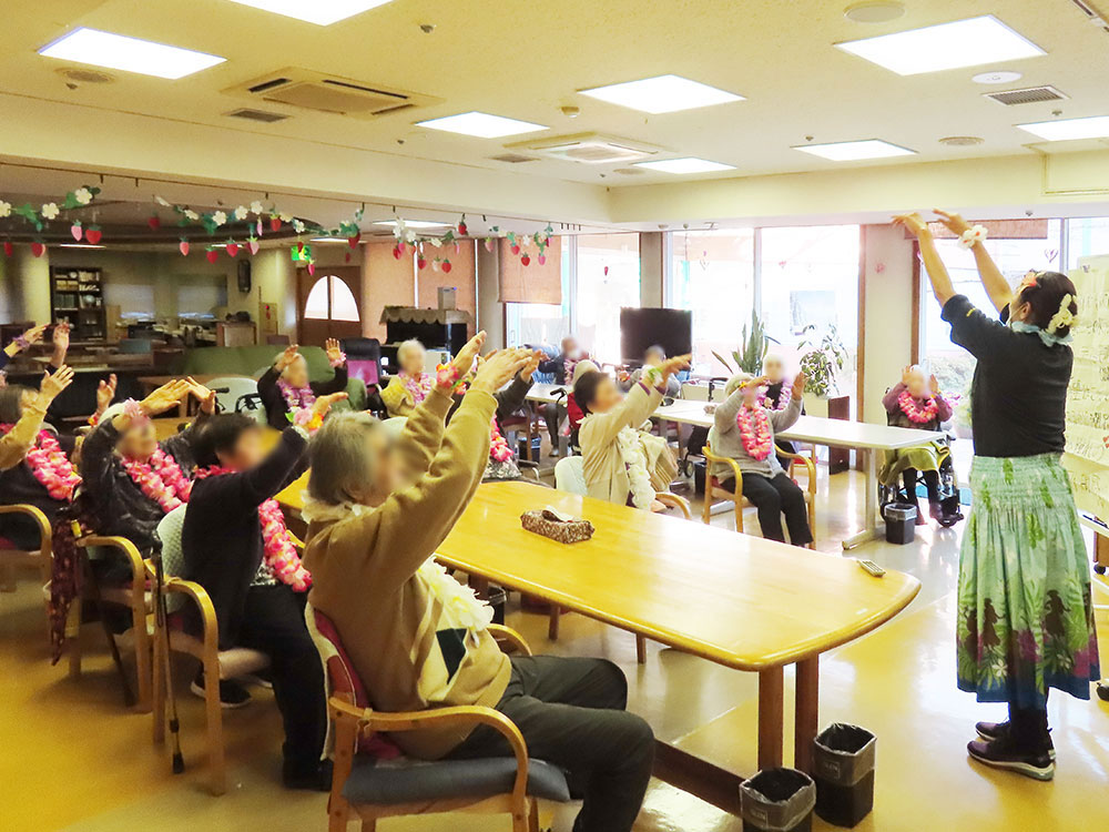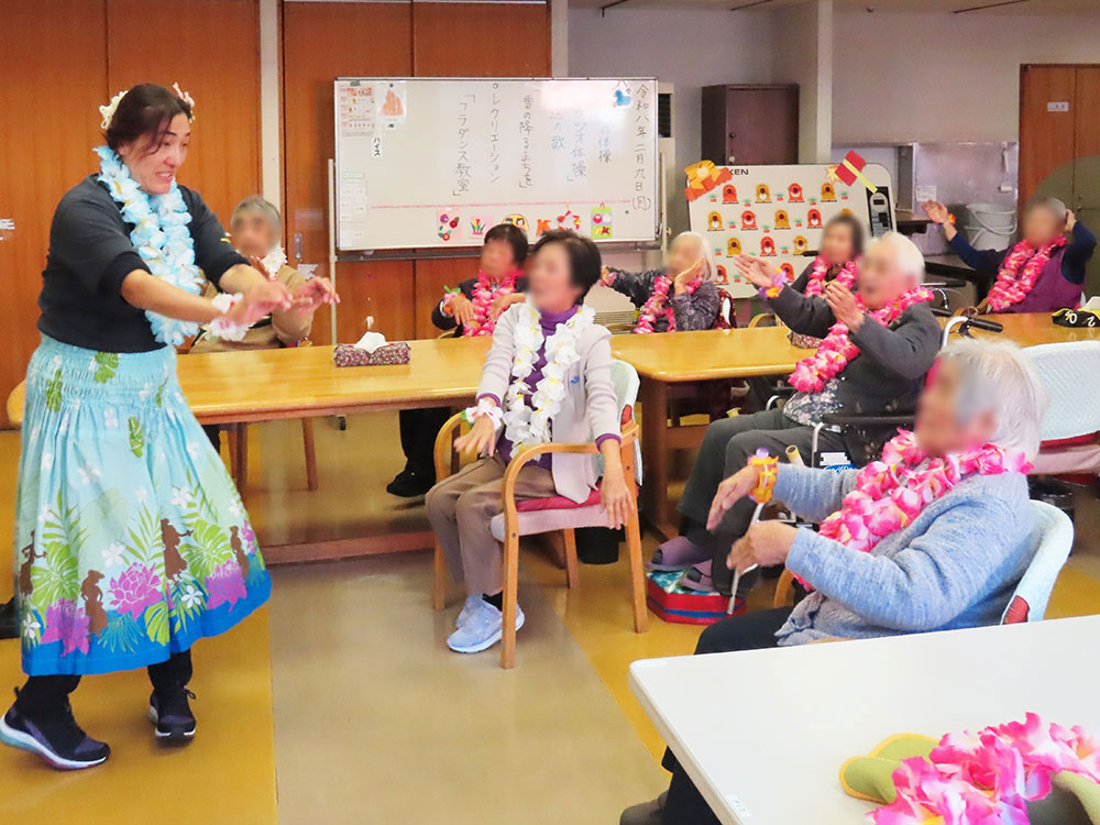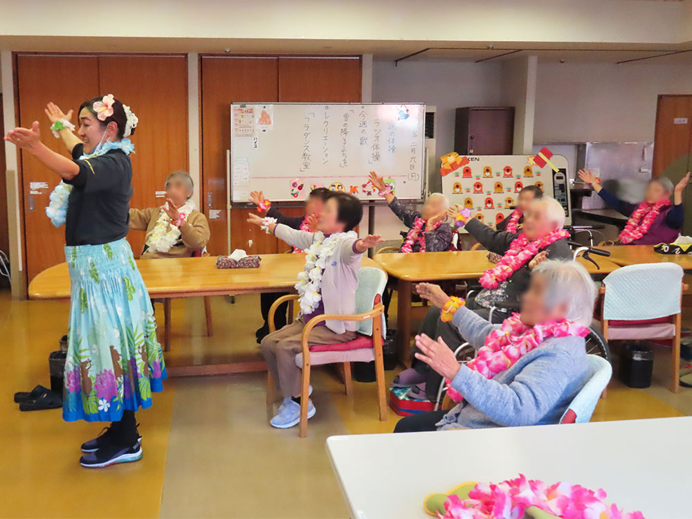 9日、デイサービスでは「アロハ先生」をお迎えし、フラダンス教室を開催しました。