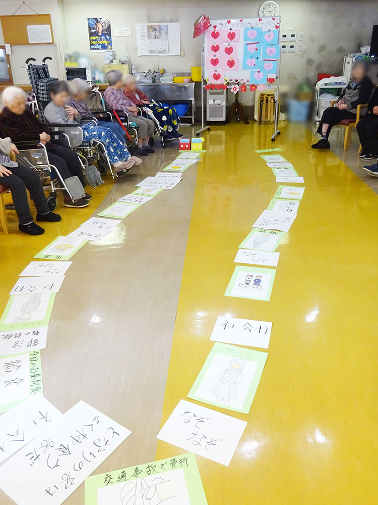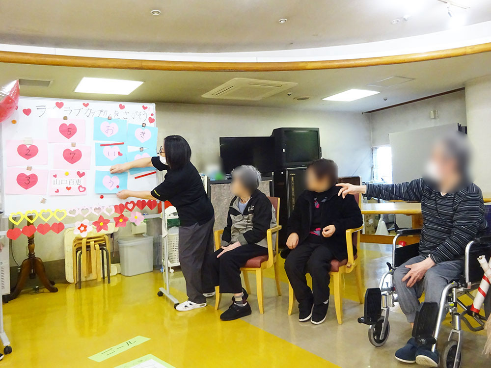 利用者様には食堂にお集まりいただき、「人生波瀾万丈ゲーム(バレンタイン編)」を開催しました。