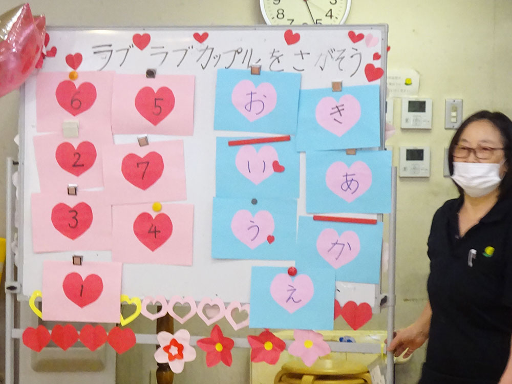 途中のイベント「ラブラブカップルを探そう」では、カードをめくって名前のペアを作り、皆様で協力しながら楽しまれていました。