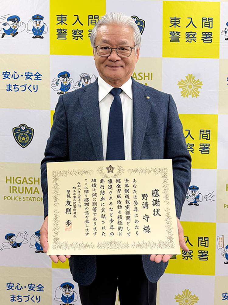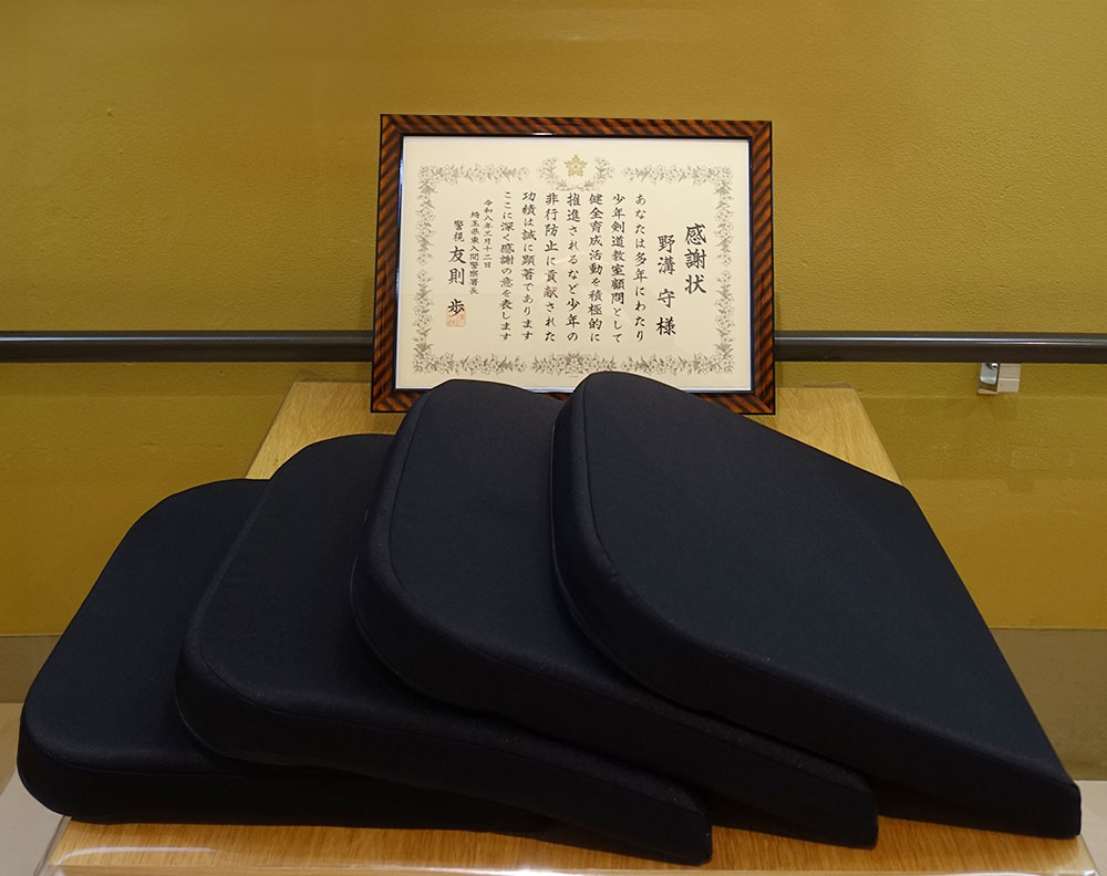 このたび、野溝守理事長が長年にわたり顧問を務めておりました東入間警察暑少年剣道教室の廃止に伴い、東入間警察署長より感謝状を、また少年剣道教室父母会の皆様より心温まる記念品をいただきました。