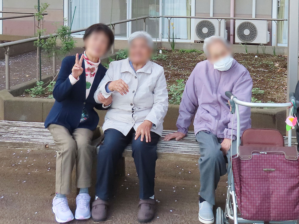 南庭に出ると、「風が気持ちいいね」「きれいに咲いているね」と自然と会話も弾み、あちらこちらで笑顔が見られました。