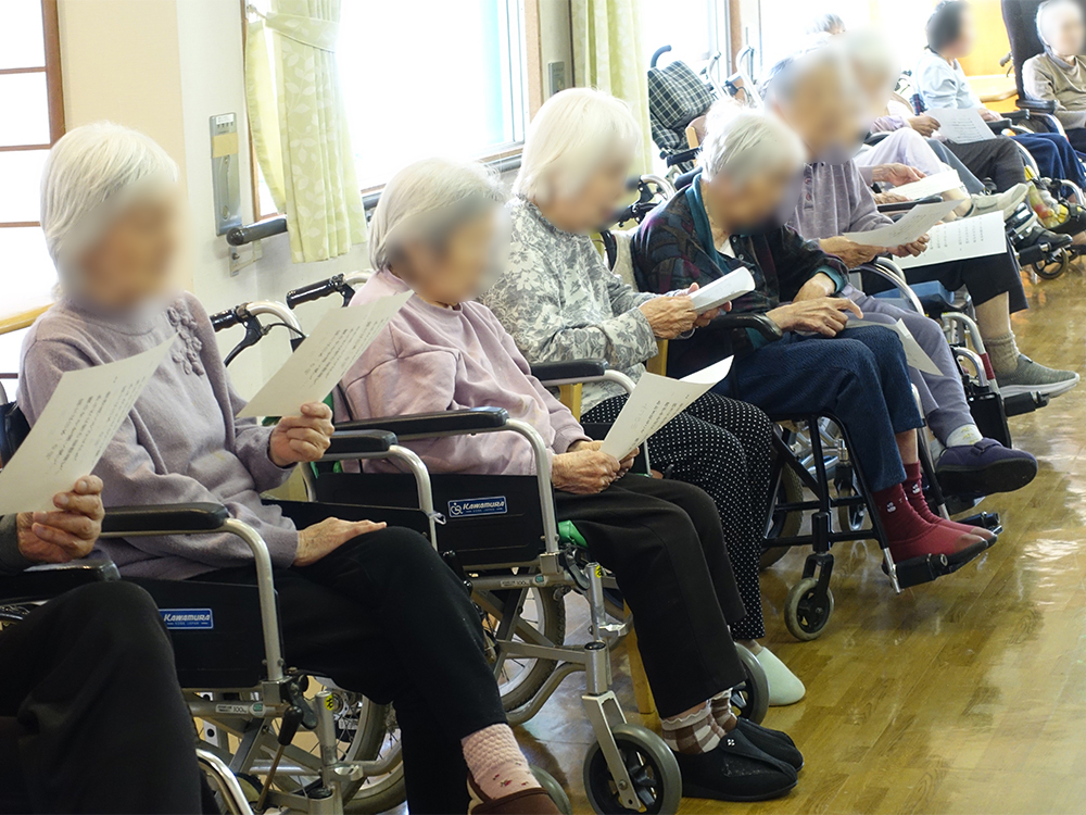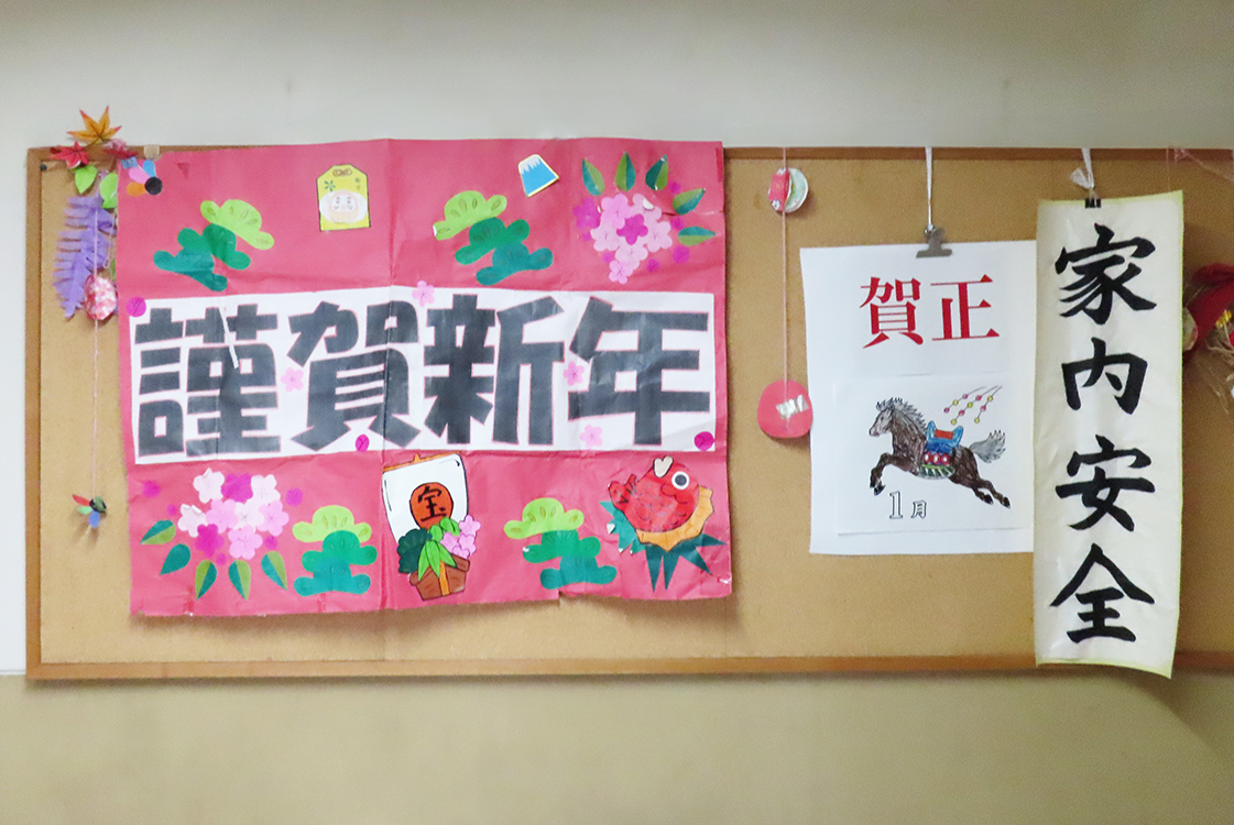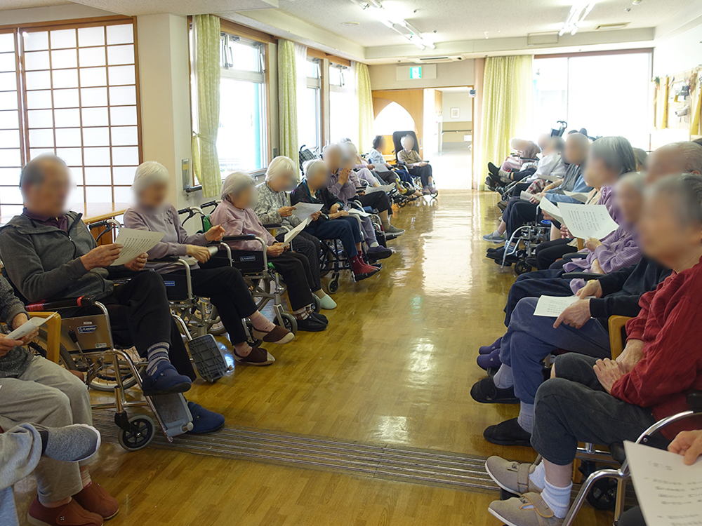 食堂にお集まりいただき、お正月の歌を皆様で一緒に歌いました。懐かしい歌に自然と笑顔がこぼれ、口ずさみながら楽しまれる姿が見られました。